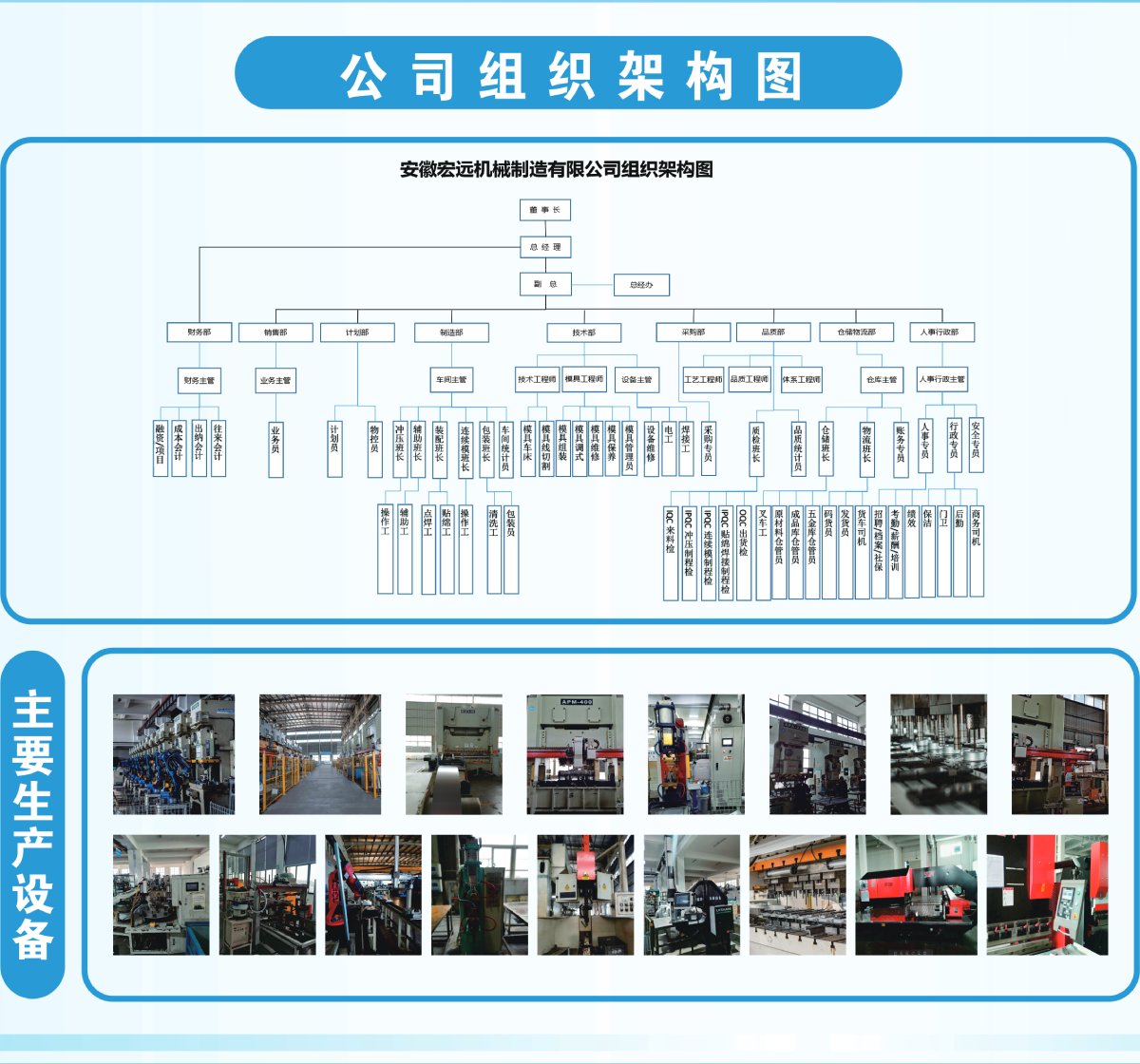 公司擁有大、中、小型沖壓及焊接機(jī)械設(shè)備近100余臺套,其中630T-1200T大臺面架框液壓機(jī)(移動(dòng)工作框臺面)5臺,氣動(dòng)100T-250T沖床20余臺,63T壓力沖床10臺,25T-40T壓力沖床20余臺,315T液壓機(jī)4臺,300T液壓機(jī)4臺,日本松下350-500電焊機(jī)20臺,電焊機(jī)、二氧化碳?xì)怏w保護(hù)焊機(jī)、氬弧焊機(jī)合計(jì)10臺,大小自動(dòng)手動(dòng)剪板機(jī)5臺,維護(hù)設(shè)備車床、銑床、刨床、磨床、搖臂轉(zhuǎn)床等11臺,引進(jìn)進(jìn)口機(jī)械手臂,實(shí)現(xiàn)全自動(dòng)線生產(chǎn),引進(jìn)空調(diào)面板全自動(dòng)生產(chǎn)線和噴涂生產(chǎn)線可供大中型企業(yè)鈑金制品零部件配套產(chǎn)品的加工。